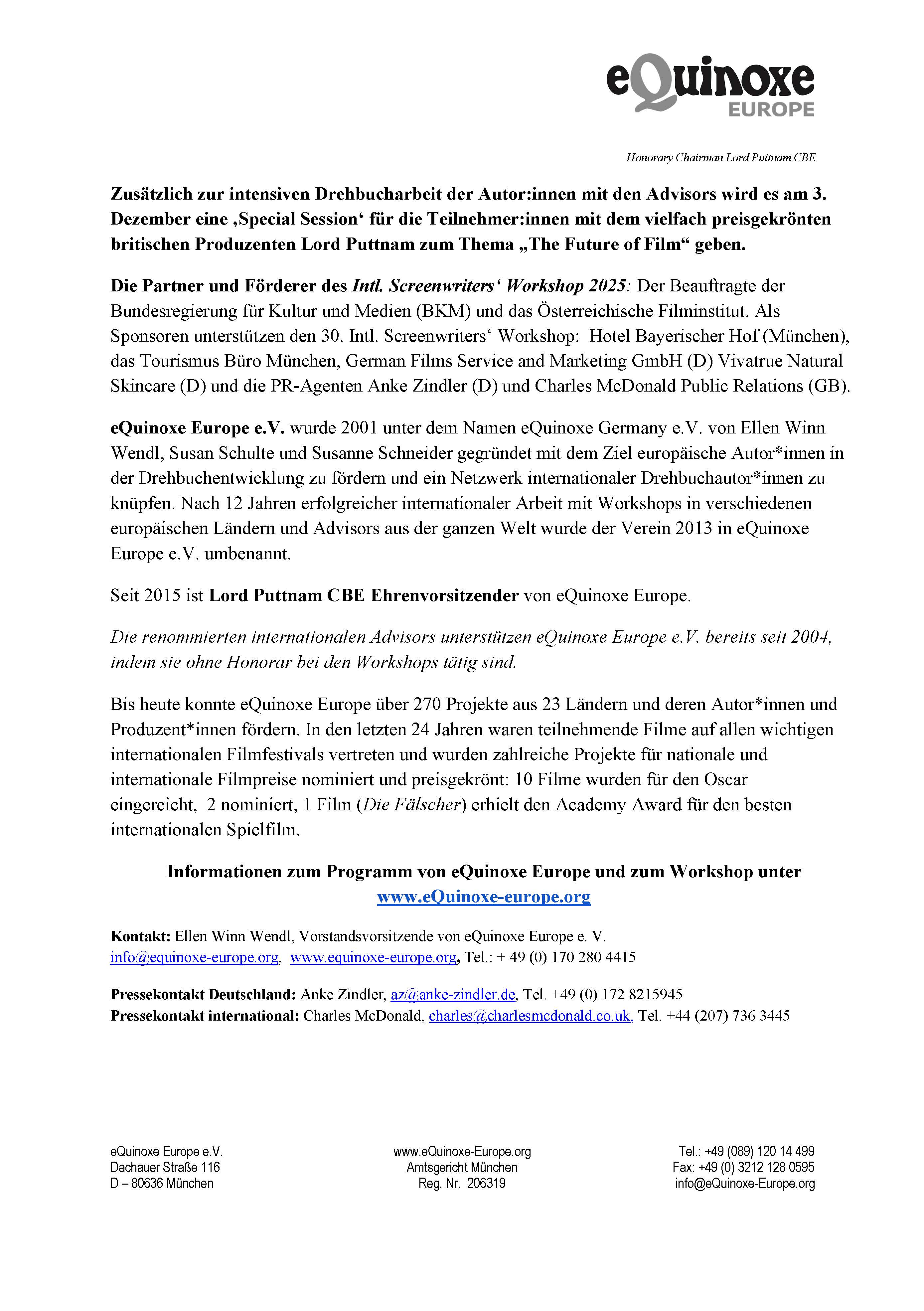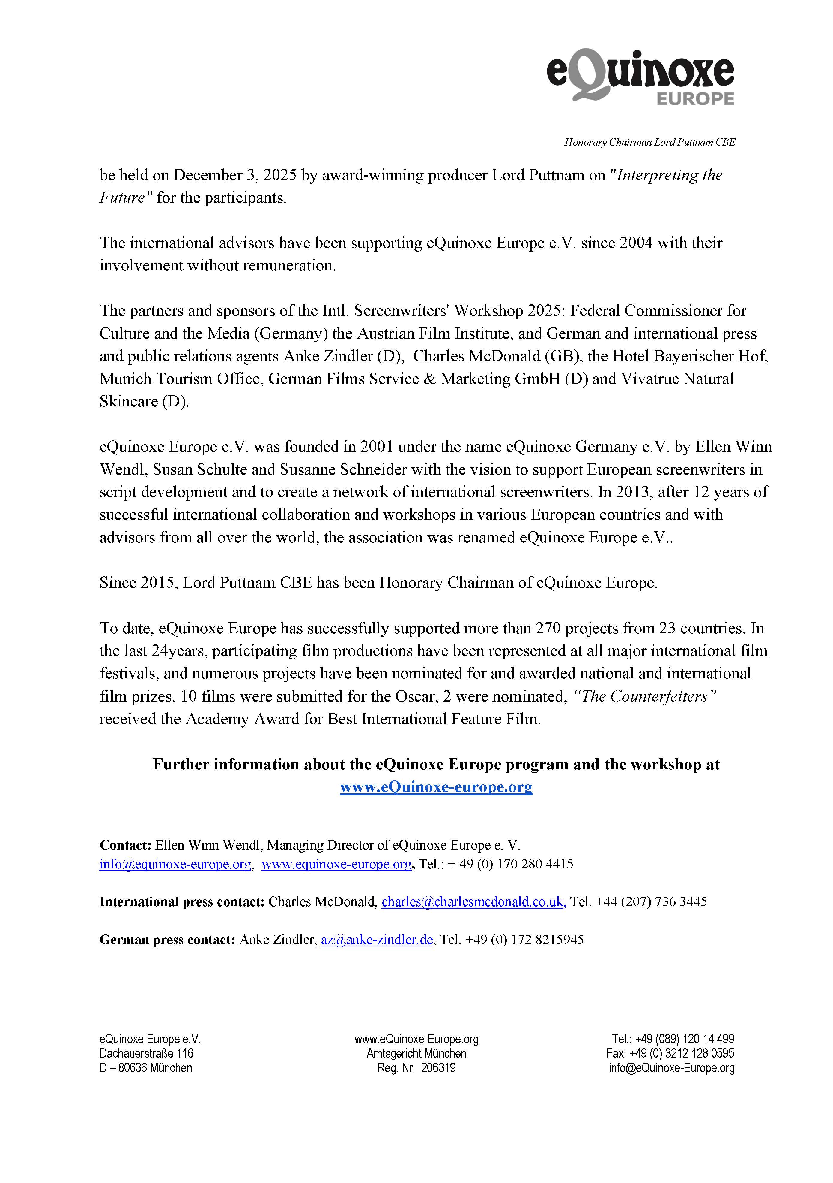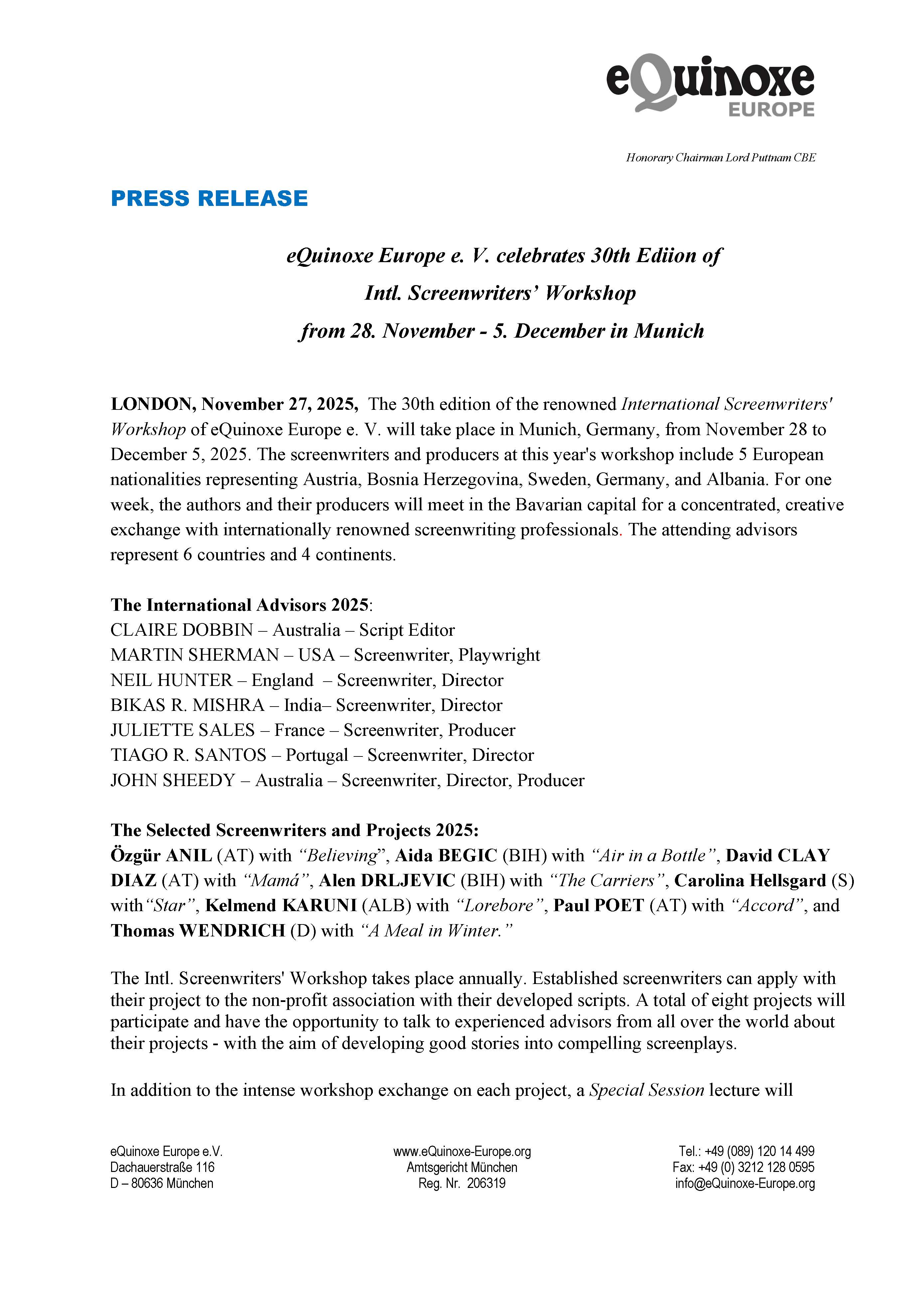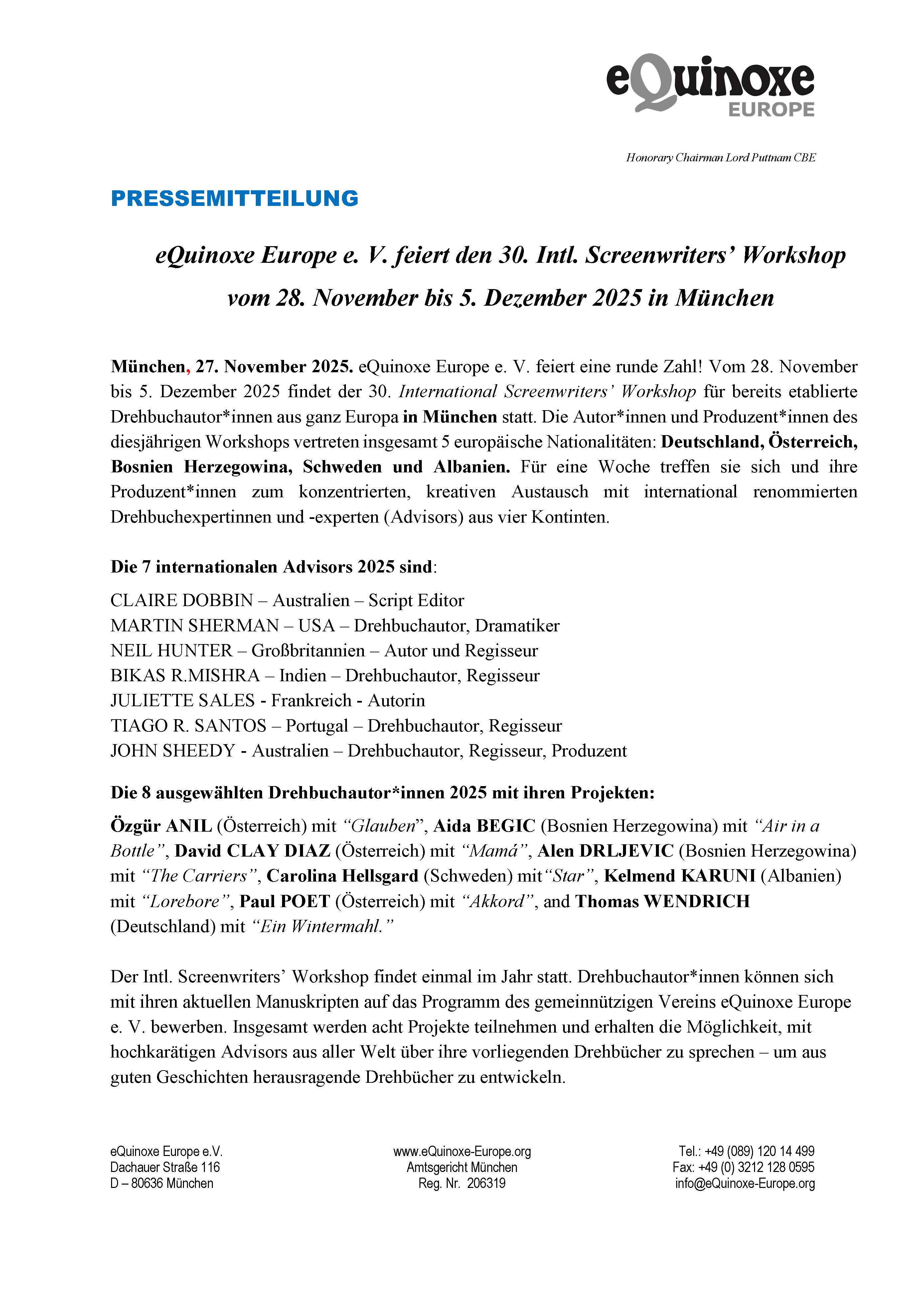 30. eQuinoxe Europe e. V. Intl. Screenwriters’ Workshop in Bavaria, Germany